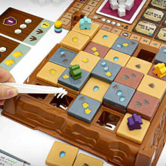 포실리스의 가장 큰 특징은 3D 컴포넌트입니다. 타일로 구성된 지형 위에 석고 타일과 모래 타일이 층층이 쌓여 있으며, 이들을 실제로 밀어내거나 제거하면서 발굴을 진행해보세요.