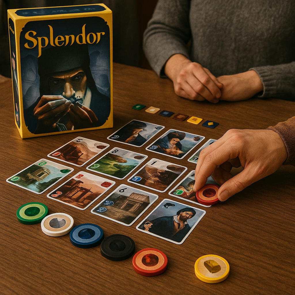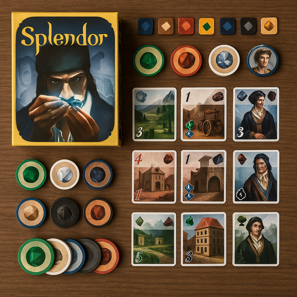 스플랜더는 보석 상인이 되어 점수를 모으는 전략형 카드 보드게임입니다. 단순한 규칙이지만 게임의 흐름은 깊이가 있고, 초보자부터 마니아까지 모두가 즐길 수 있어 가족 보드게임, 2인 보드게임, 커플 보드게임으로도 인기입니다.